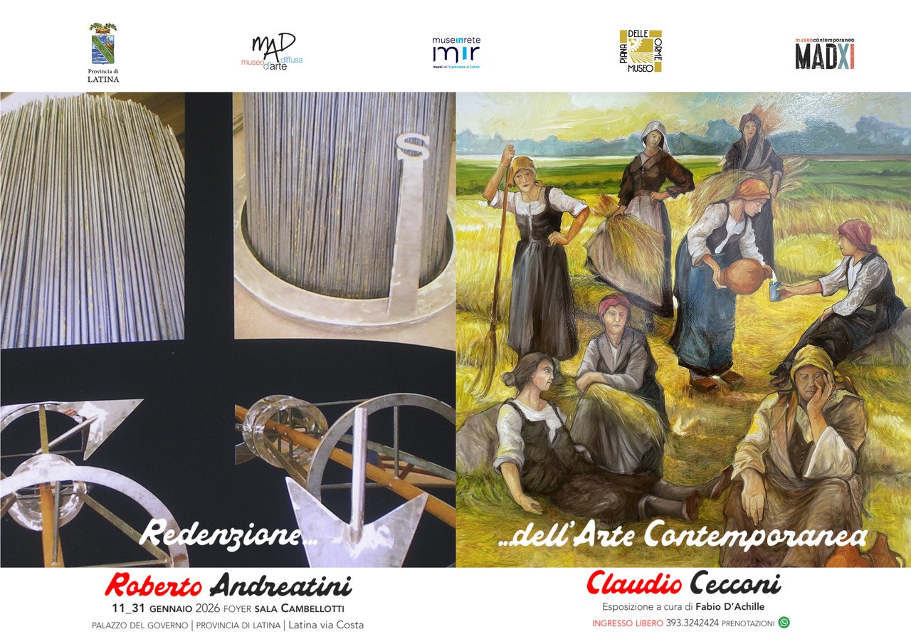 Dall’11 gennaio 2026 il Foyer della Sala Cambellotti del Palazzo della Provincia di Latina ospiterà una nuova mostra del progetto “Redenzione dell’Arte Contemporanea”, promosso dal MAD – Museo d’Arte Diffusa e curato da Fabio D’Achille, con il supporto dell’Ente Provinciale. In esposizione le opere di Roberto Andreatini e Claudio Cecconi, due artisti che, con percorsi e linguaggi differenti, rappresentano un punto di riferimento per la ricerca artistica contemporanea legata al territorio pontino.