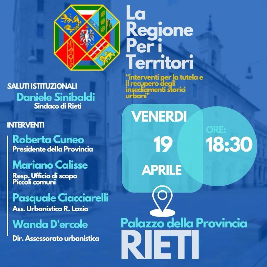 La Provincia di Rieti ospiterà venerdì 19 Aprile l’evento “La Regione Per i Territori - interventi per il recupero degli insediamenti storici urbani". Con il via libera della Giunta della Regione Lazio alle modalità di erogazione dei contributi ai comuni del Lazio, per interventi di tutela e recupero degli insediamenti urbani storici, iniziano gli incontri con gli amministratori locali per discutere di questa importante opportunità.